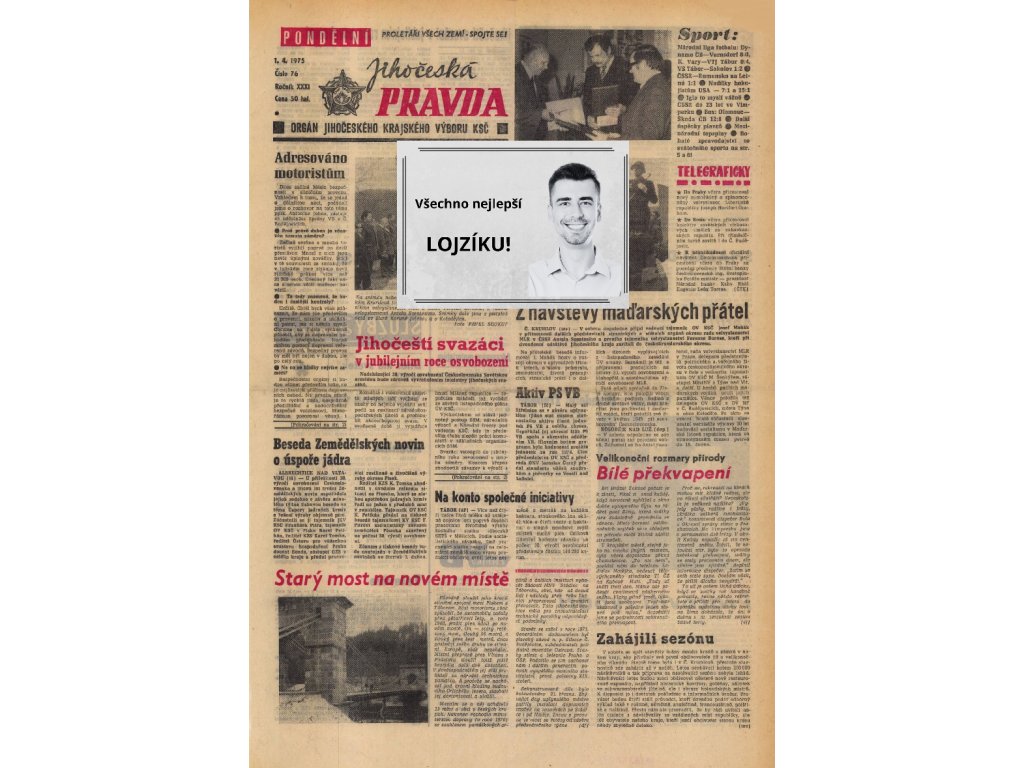 Zajímá vás, co hýbalo jihočeským krajem den, kdy jste přišli na svět? Darujte kousek historie. Přesná replika dobového vydání Jihočeské pravdy vás přenese zpět v čase a odhalí autentickou atmosféru a zprávy z vámi zvoleného data.