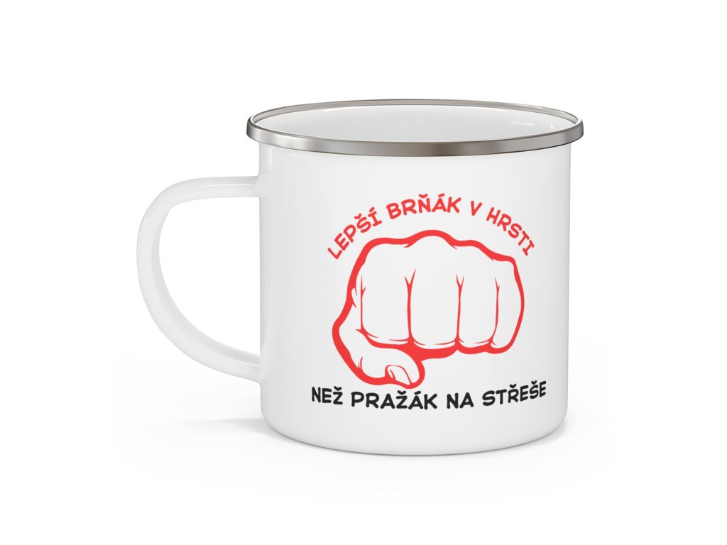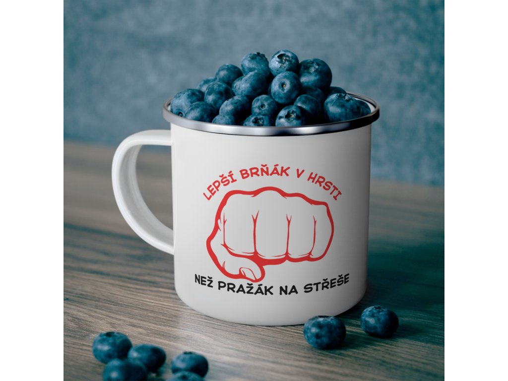 Bílý kovový hrnek - plecháček je určen k ručnímu mytí, ale vzhledem k vysoce kvalitní polymerní vrstvě jej můžete mýt i v myčce. I po několika umytích jsou barvy stále syté.